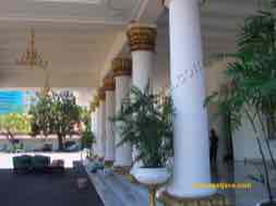 In the beginning, this building of course faced to Kali Mas, so that in the evening its dweller with have drinking tea they also can see boats tracing times. The boats also exploited as supporting facilities for transportation. They come and go by using boat to trace Kali Mas. In the next development is luxury building that also used for session place Raad van Justitie (High court), also used for party, reception and others. In 1802 Grahadi Building, which initially face to north is changed position become to face to south like present. It is crossed by it, there are garden which called Kroesen (Taman Simpang), what taken away from Resident JC. Thorium name Kroesen (1888-1896). Rear the garden there are Joko Dolog statue is coming from Singosari Empire, which now still standing steady. Since Indonesia independence the first East Java Governor who residing in Grahadi is RT. Soerjo (1946-1948), which his statue is, now seems to be crossed the building. Since governor Samadikoen (1949-1957) hitherto this building is made as the state building to receive guest, reception, and other meetings, while the Governor self is resided in other residency in Surabaya town.