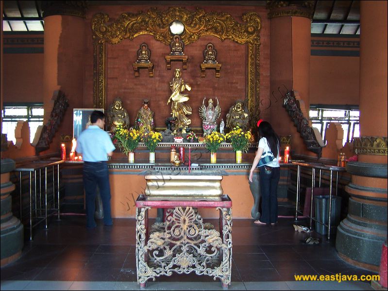 Like any other temples that we can find, Sanggar Agung temple has particular in design and also in its atmosphere, the design is very unique and quite sophisticated. From the very inside of the building, the back side is outstandingly amazing with the great goddess of Kwan Im Pouw Sat statue and four statues for the guardians, which is one of them is Kwan Kong, the god of war. There are also two dragons statue over the goddess and the guardians that look strong and firm in 6 meters long. The Kwan Im statue has 20 meters high, and look nice over the beauty of the masterpiece. Those statues are build after less than 2 years from the temple was build.